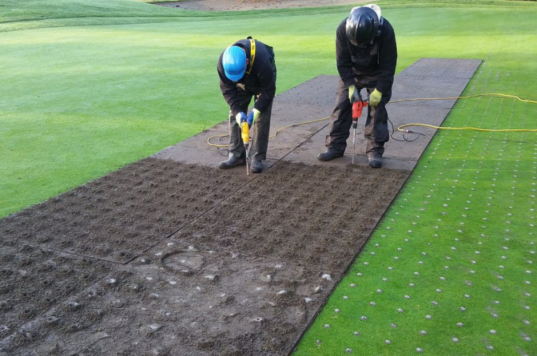 Подготавливая ландшафт к холодам, необходимо также провести аэрацию почвы. Газон нужно проколоть вилами не глубже чем на 20 см с интервалом в 30-40 см, чуть поднимая дернину. Аэрация тем более важна, если грунт глинистый и может не проводиться на грунте песчаном. Она дренирует почву, стимулирует поступление воздуха к корням травы. После прокалывания нужно избегать ходить по газону и подвергать его нагрузке 2-3 дня.